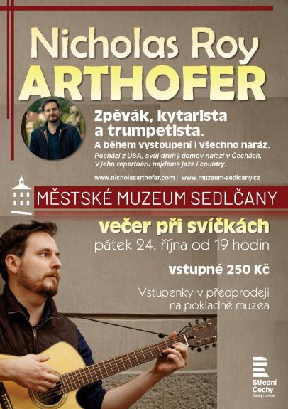 NICHOLAS ROY ARTHOFER Jedinečné hudební vystoupení výjimečného multiinstrumentalisty původem ze Spojených států amerických, který svůj druhý domov nalezl v Čechách. V jeho repertoáru najdeme jazz i country. Vstupenky v předprodeji na pokladně muzea.